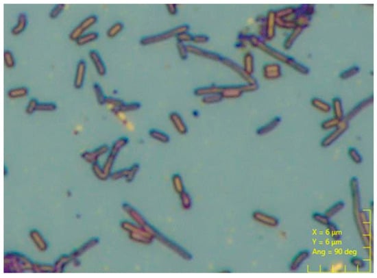 The bacterial strain used in the experiments is a Gram-positive Bacillus pasteurii, a non-pathogenic species. It thrives under a wide range of environmental conditions, including varying pH, temperature, and salinity, which are often encountered in soil stabilization applications. The cells are rod-shaped, approximately 2 to 3 µm in length, and can grow well in alkaline media at temperatures ranging from 15 to 37 °C. This strain is commonly found in wastewater and soil. The Bacillus pasteurii cultured in the experiment was initially identified using an inverted biological microscope (IX83, OLYMPUS, Tokyo, Japan) and Gram staining technique. The observation results (Figure 2) are consistent with the characteristics of Bacillus pasteurii.