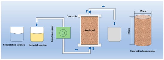 The sample preparation process is illustrated in Figure 3. For the preparation of cylindrical samples, the initial step involved weighing the required quantities of sandy soil and fibers, followed by thorough mixing. To prevent fiber clumping, the fibers were pre-dispersed prior to mixing. Once the fibers were evenly mixed with the sandy soil, the mixture was layered into a PVC cylindrical mold with an inner diameter of 39 mm and a height of 80 mm. To prevent sandy soil leakage from the mold and avoid erosion at the sample ends during the grouting process, a geotextile was placed at both ends of the mold. The geotextile also ensured uniform distribution of the injected liquid throughout the sample. After the mold was filled with the mixture, grouting was performed using an intermittent stepwise injection technique. A peristaltic pump was used to deliver the bacterial solution and cementation solution into the mold at a constant rate in a stepwise manner to achieve effective binding. During each grouting round, 50 mL of bacterial solution was added first, followed by a 2 h interval to allow for natural penetration, after which 200 mL of cementation solution was added. This process was repeated for four rounds of grouting. To ensure a more uniform distribution and reaction of the bacterial and cementation solutions among the soil particles, and to mitigate the impact of calcium carbonate precipitation at the sample ends that could obstruct the infiltration of the grouting liquid, a bottom-to-top alternating inversion filling technique was employed. The samples, after completing the grouting process, were placed in an oven and dried at a temperature of 60 °C for 24 h. Once dried, the samples were ready for performance testing.