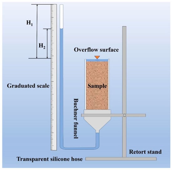 According to the geotechnical test method standard (GB/T 50123-2019) [44], a simple device for measuring the permeability was created based on the test principle of the variable head method (Figure 4). The device consisted of a transparent silicone hose, a scale, a Brinell funnel, and an iron frame. The silicone hose, Brinell funnel, and sample were sealed together. The test was conducted by gradually adding distilled water to the transparent silicone hose. Due to gravity, the distilled water entered the soil from the bottom of the sample. After a period of time, water seeped through the top of the sample and accumulated until it overflowed from the top of the pipe. At this point, distilled water was added to the silicone hose to the appropriate height, after which the addition was stopped. The height difference between the concave liquid level in the hose and the upper end of the PVC pipe (overflow surface) was recorded. After an interval of time , the height difference between the concave liquid level in the silicone hose and the overflow surface was recorded. The formula for calculating the permeability coefficient of the sample is provided as follows:
