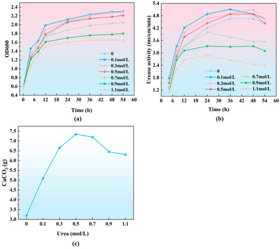 Effect of urea concentration on the growth status and mineralization efficiency of Bacillus pasteurii. (a) Curve of the OD600 value of Bacillus pasteurii. (b) Curve of urease activity of Bacillus pasteurii. (c) Effect of urea concentration on calcium carbonate production.