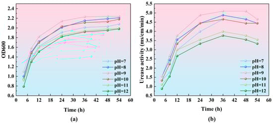 Effect of pH on the growth status of Bacillus pasteurii. (a) Curve of the OD600 value of Bacillus pasteurii. (b) Curve of urease activity of Bacillus pasteurii.