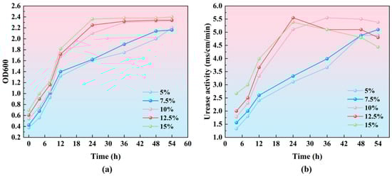 Effect of inoculum size on the growth status of Bacillus pasteurii. (a) Curve of the OD600 value of Bacillus pasteurii. (b) Curve of urease activity of Bacillus pasteurii.
