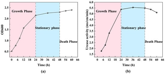 Growth curve of Bacillus pasteurii under optimal culture conditions. (a) Curve of the OD600 value of Bacillus pasteurii. (b) Curve of urease activity of Bacillus pasteurii.