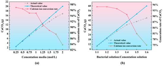 Figure 9b illustrates the influence of the volume ratio between bacterial suspension and cementing medium on the amount and rate of calcium carbonate precipitation. As shown in the figure, when the cementing medium concentration is 1 mol/L, the CaCO3 precipitation rate decreases with an increasing volume of cementing medium. Specifically, when the volume ratio of bacterial suspension to cementation medium exceeds 1:4, the CaCO3 yield drops significantly to below 90%.
