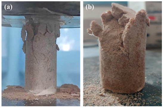 Figure 10 shows the failure morphology of the samples from the group with no fiber content during the unconfined compressive strength test. It is evident from the figure that the failure mode is typical of brittle failure. During the failure process, due to the applied external force, cracks first appear on the surface of the sandy soil column, forming fracture surfaces and causing localized failure. As the external force continues to increase, the collapse caused by the localized failure extends downward until the entire column becomes unstable and the original structure is completely destroyed. Throughout the entire loading process, sand particles continue to detach due to the formation of fracture surfaces. After brittle failure, the sandy soil column exhibits an irregular failure surface, with large depressions and protrusions. The residual sandy soil after failure becomes loose, with the once relatively compact sand particles dispersing due to the fracture. The remaining sandy soil is seen as scattered individual sand particles, fragments, or clumps.