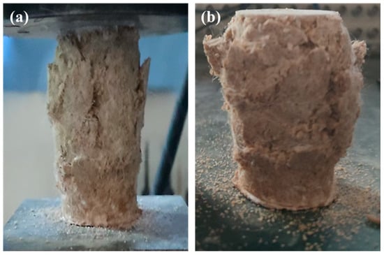 Figure 11 depicts the failure morphology of the samples from the experimental group with 0.6% fiber content during the unconfined compressive strength test. Unlike the sudden fracture of brittle failure, the failure mode here involves more noticeable deformation, characteristic of ductile failure. During the failure process, small cracks first appear in localized areas of the sandy soil column. As the stress increases, these cracks expand along multiple paths, gradually forming larger fissures. The sandy soil gradually loosens, but no rapid collapse occurs. Under the tensile force of the fibers, the sandy soil undergoes a slower failure process. Throughout the failure, the specimen experiences compressive deformation due to the external force. Due to the presence of fibers, the surface of the specimen after failure exhibits a relatively uniform crack distribution, without distinct fracture surfaces. Additionally, the residual sandy soil structure after failure retains a certain degree of integrity, not completely disintegrating, and the sand particles do not experience significant detachment.