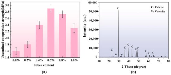 Macroscopic performance and microscopic characterization of microbial solidified sandy soil samples. (a) Effect of fiber content on unconfined compressive strength of microbial solidified sandy soil samples. (b) XRD image of cementing material.