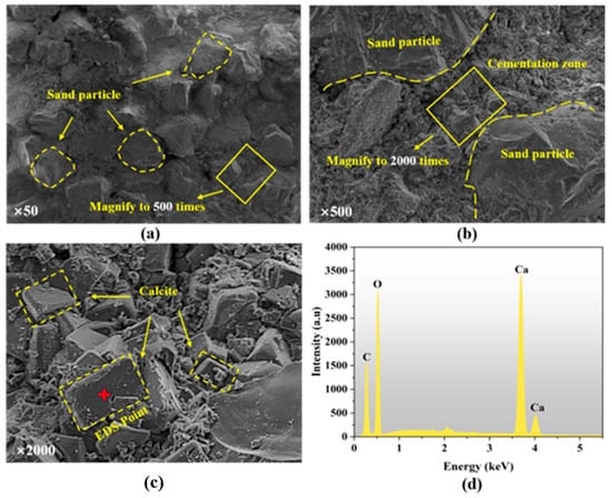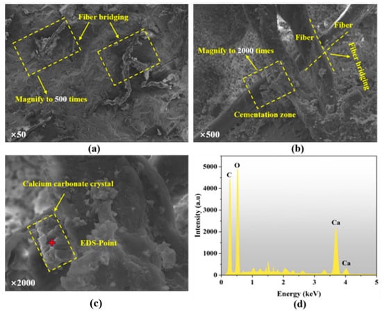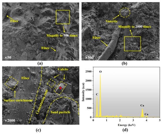 SEM–EDS image of sandy soil sample solidified by microorganisms with a fiber content of 0.6%. (a) SEM image with 50 times magnification. (b) SEM image with 500 times magnification. (c) SEM image with 2000 times magnification. (d) EDS image of cementing material.