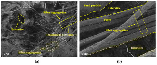 While fiber reinforcement enhances the performance of MICP-treated soils, excessive fiber content adversely affects soil stabilization. When fibers agglomerate in the soil, they interlace and overlap with each other, preventing them from dispersing effectively within the soil and leading to the formation of irregular void structures. These voids are not the pores formed by soil particles but are structural voids created by fiber agglomeration. The structure formed after fiber cohesion is typically irregular and may contain some larger voids. These voids are not individual pores but a porous structure resulting from fiber agglomeration. This structure may include larger gaps and irregular channels, which increase the overall porosity. The size and shape of these irregular voids can vary significantly, leading to a non-uniform increase in soil porosity. Additionally, under normal conditions, fibers may fill the gaps between soil particles, increasing the compaction of the soil. However, when fibers agglomerate, the contact area between the fibers and soil particles is reduced, causing the fibers to be less effective at connecting with the soil particles compared to when they are individually distributed. As a result, the fibers are unable to efficiently fill the soil’s pores, leading to an increase in porosity. The larger voids and pores in fiber agglomeration areas make these regions weak points within the soil [73,74]. When subjected to external forces, these agglomerated regions create stress mismatch zones with the surrounding soil. Such areas are more prone to localized failure or crack propagation, which can lead to a reduction in overall soil strength and an increased risk of structural failure. Additionally, fiber agglomeration hinders the even distribution and diffusion of microorganisms within the soil. This results in a reduced and uneven distribution of the cementing agents produced during microbial stabilization, which affects the interface forces between sand particles and fibers. Consequently, this reduces the uniformity and strength of the stabilized soil [68,75].