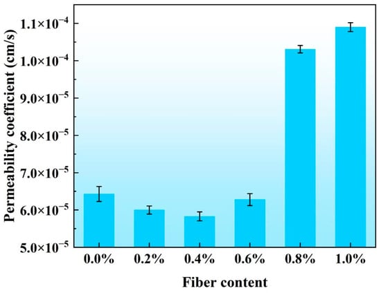 When the fiber content exceeds 0.6%, the permeability coefficient of the samples increases significantly, resulting in a notable decline in impermeability performance. At a fiber content of 1%, the permeability coefficient reaches 1.09 × 10−4, which is 69.5% higher than that of the samples without fiber.