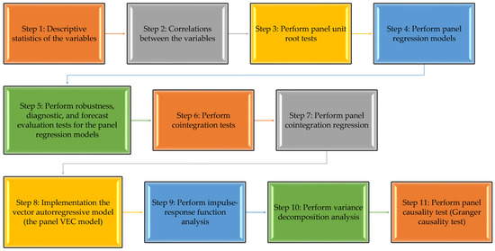 From a methodological perspective, the discussion focused on methodologies and techniques that are specific to the analysis of panel data. These methodologies and techniques included the following: the common-effects model, the fixed-effects model, the random-effects model, the cointegration regression model, and the autoregressive model, which was implemented in the VAR/VEC form.
