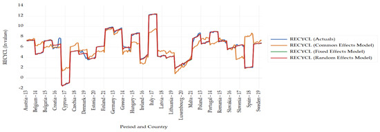 where is the dependent variable (i.e., the natural logarithm of RECYCL); is the intercept term; indicates the estimated coefficients; is a vector including the independent and explanatory variables; is the error component that reflects each cross-sectional dimension and shows the differences between the countries; is the error term; indicates the cross-sectional dimension (i.e., the EU countries, t = 1 to 27); and represents the temporal dimension (i.e., t = 2013 to 2021).