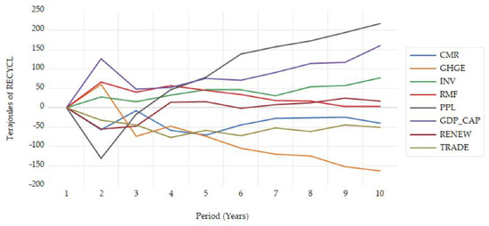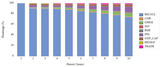Moreover, it is anticipated that the present study will provide valuable insights on how the consumption of recyclable materials constitutes a transmission channel of the circular economy by revealing those causal relationships and interactions that propagate differently across European countries [6,8,10,14]. The empirical evidence obtained from the application of the model provides and generates a starting point for new interests and concerns in the study of the comprehensive phenomenon of the circular economy. It may also be suitable and appropriate in the formulation of new future directions of environmental policy and the promotion of climate neutrality by European institutions.