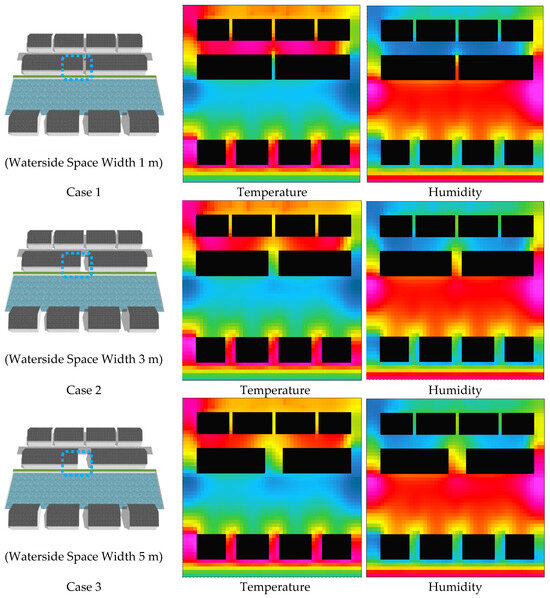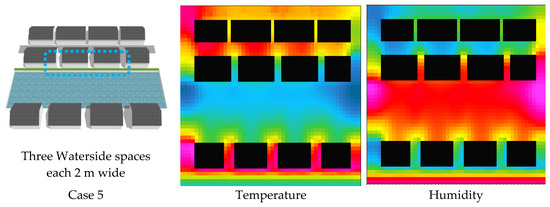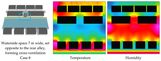 Additionally, as seen in Figure 10, the dispersed arrangement of waterside spaces (such as Case 5 and Case 6) and the centralized arrangement (such as Case 7) have a minor difference in their impact on the temperature and humidity of the district. However, the centralized arrangement (Case 7) can significantly increase the wind speed of the streets, thereby further enhancing the thermal comfort of the space. Therefore, under the condition of the same total width, it is recommended to prioritize the centralized layout of larger waterside spaces in the design to optimize the wind environment of the district and improve the overall spatial quality.