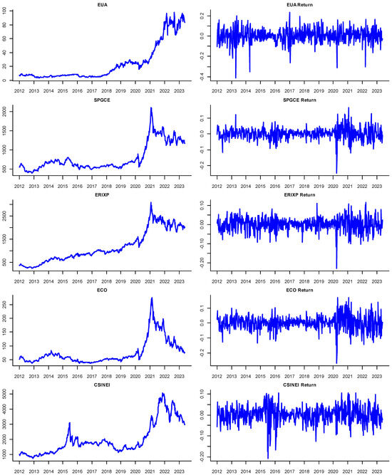 We examine weekly data on carbon prices and four clean energy indices from 1 January 2012, to 7 May 2023, totaling 593 observations. The EUA futures price series (CP) from the Intercontinental Exchange (ICE) denotes carbon pricing, utilizing settlement prices from continuous contracts for the spot month. The clean energy indexes comprise the S&P Global Clean Energy Index (SPGCE), European Renewable Energy Index (ERIXP), Wilder Hill Clean Energy Index (ECO), and CSI New Energy Index (CSINEI). SPGCE is a worldwide index of 100 clean energy-related equities, whereas ERIXP, ECO, and CSINEI denote the clean energy sectors in Europe, the United States, and China, respectively. Data for CP, SPGCE, and CSINEI are obtained from WIND, whereas ERIXP and ECO are supplied from Bloomberg. We apply the natural logarithmic prices and returns of these indices in our analysis.