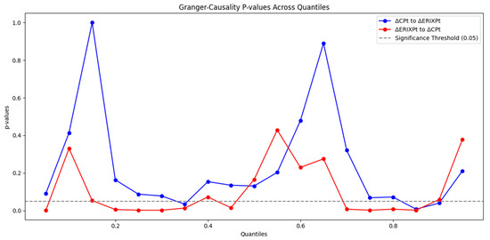 We additionally illustrate the p-values of the test for quantile Granger-causality between carbon and four clean energy indexes. Figure 3 illustrates the Granger-causality p-values across quantiles for the bidirectional link between ΔCPt and ΔERIXPt. The blue line denotes the p-values for assessing whether ΔCPt Granger-causes ΔERIXPt, whereas the red line signifies the p-values for the inverse causality. The dashed horizontal line at 0.05 indicates the standard significance threshold. Values below this level indicate statistically significant causation at the respective quantiles. The results indicate differences in causal influence at various quantile levels, suggesting possible nonlinear dynamics in the link between the two variables. Similarly, the unprecedented data indicate that nonlinear dynamics exist in the causal relationships between quantiles among CP, SPGCE, ECO, and CSINEI.