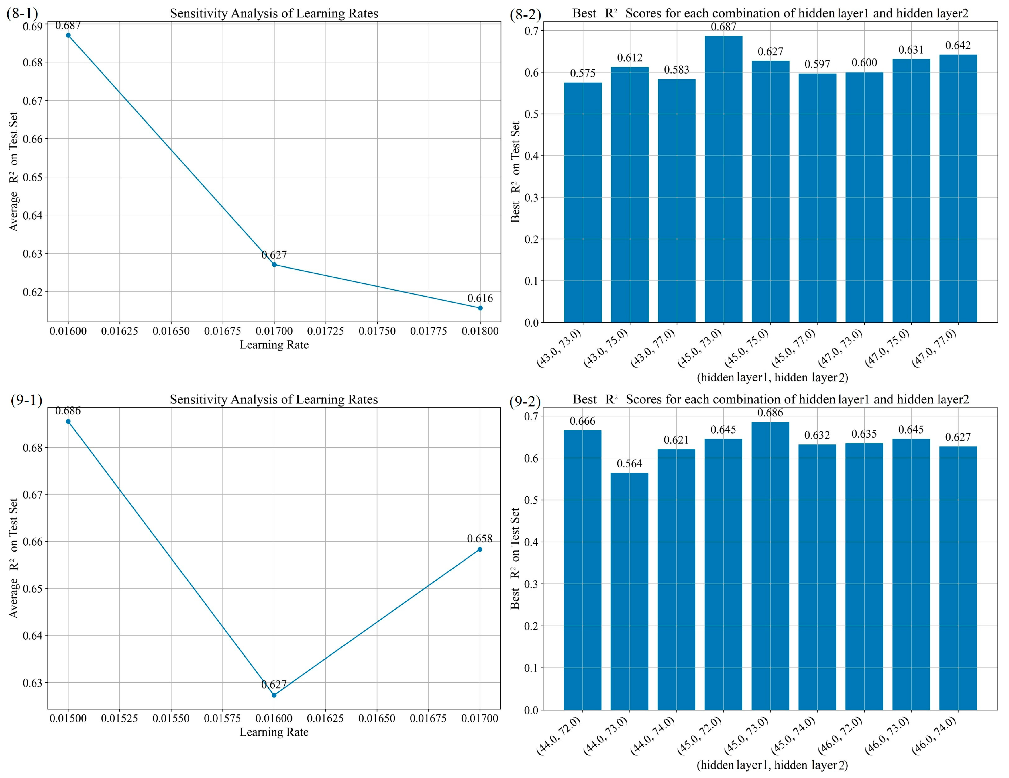 Figure 11. Experimental process diagram for parameter optimization in simulating the transparency of ULLs supplied by surface water using the ANN model. Subfigures numbered 1 to 9 correspond to the experiment numbers in Table 2, where subfigures with the suffix “-1” display the sensitivity analysis of learning rates, while those with the suffix “-2” show the best R2 scores obtained under different hidden layer combinations.