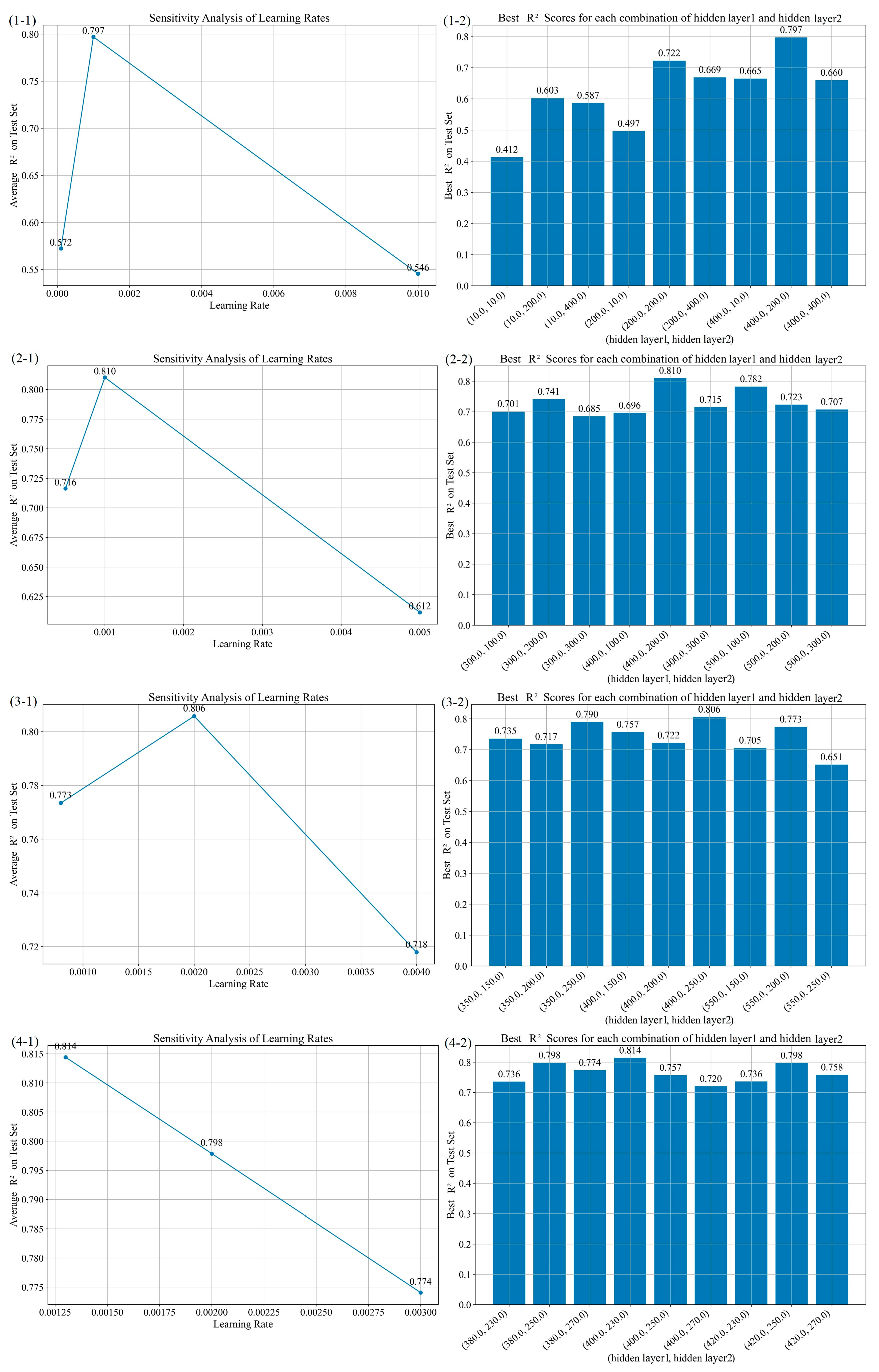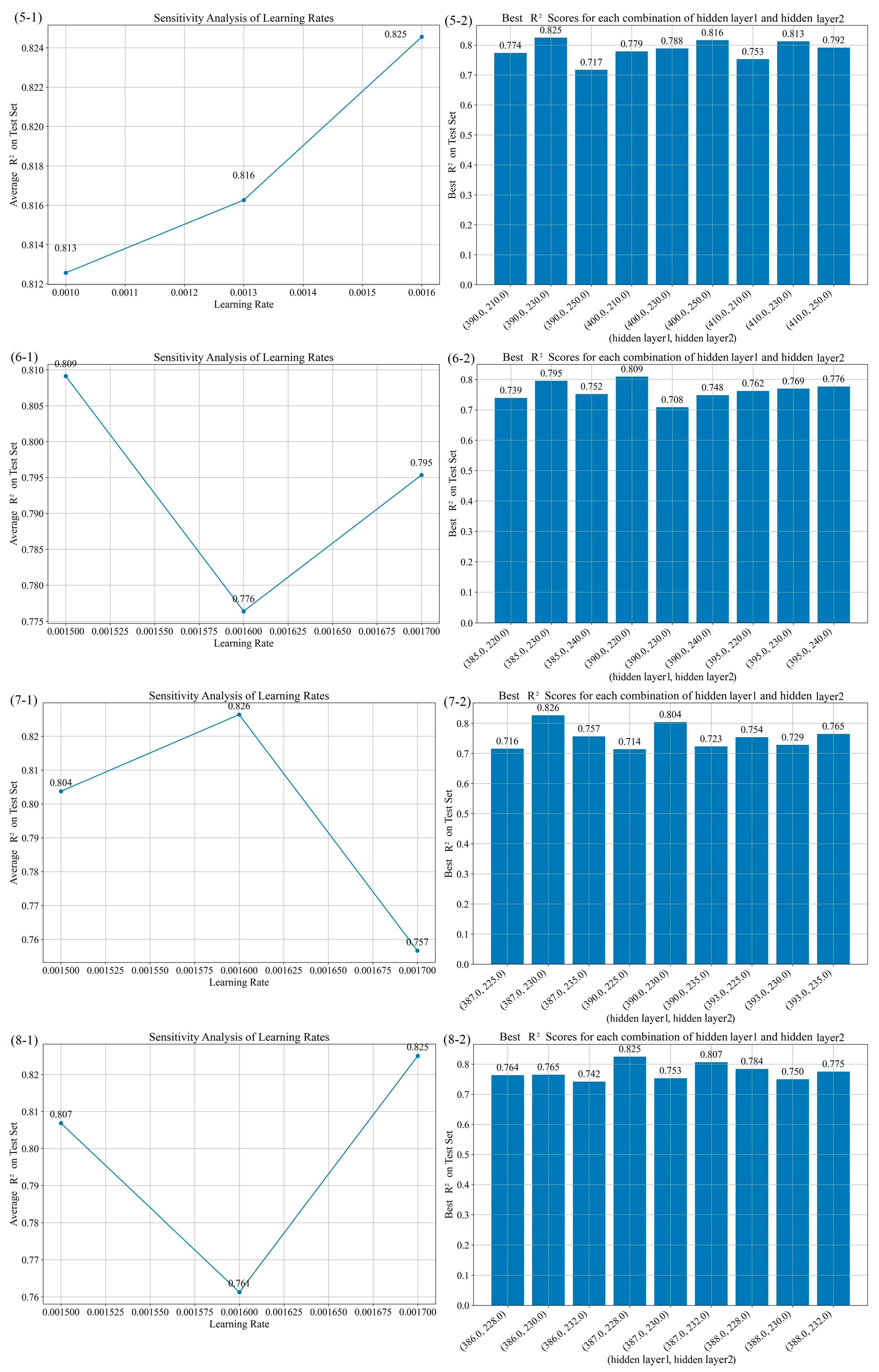 Figure 13. Experimental process diagram for parameter optimization in simulating the transparency of ULLs with rainwater storage using the ANN model. Subfigures numbered 1 to 8 correspond to the experiment numbers in Table 4, where subfigures with the suffix “-1” display the sensitivity analysis of learning rates, while those with the suffix “-2” show the best R2 scores obtained under different hidden layer combinations.
