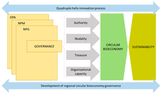 In this context, NGP emerges as a governance model that allows the articulation of different stakeholders to deal with the CBE. Adaptation of rules, procedures, and structures, as well as the coordination of funding, demand new governance models that engage with stakeholders and citizens in policymaking, by enabling citizens and companies to play a legitimate proactive role as collaborators and creators [29,32]. To achieve this implication, communication and nodality work as key links (Figure 5).