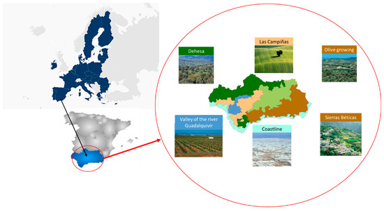 Therefore, agricultural activities are the main source of employment in half of the Andalusian municipalities, with fruit and vegetable production predominant in the area. These agricultural products, mainly from horticulture, are typically produced following intensive practices in greenhouses. There are extensive vineyards, and citrus and berry farms. Thus, agriculture is a key economic, environmental, and social sector in the region. Data show that Andalusia is a global leader in the olive sector. The region boasts more than 1.5 million hectares of crop, which generates more than 24% of the value of Andalusia’s agricultural production and 80% of Spain’s olive oil production. Andalusia’s agricultural diversity is due to its varied orography, which includes areas of “Dehesa”, countryside, olive groves, the Bajo Guadalquivir, coastline, the Sierras Beticas, among others (Figure 3).