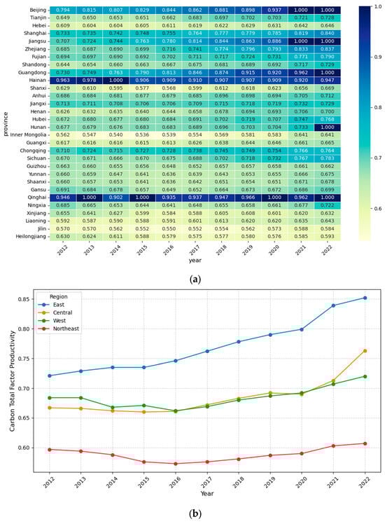 CTFP results from 2012 to 2022. (a) Thermal chart of CTFP measurement results of 30 provinces and cities; (b) the line chart of carbon TFP measurement results of four regions.