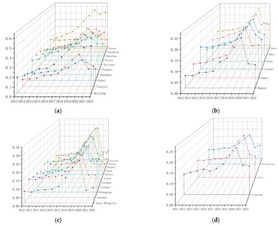 Compared to traditional productive forces, the development of NQPFs reflects a region’s level of scientific and technological innovation, the degree of digitalization of the economy, and the potential for green and low-carbon economic transformation. Figure 2 illustrates the changes in the level of NQPFs among provinces and municipalities within the four major regions.