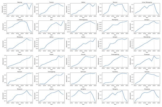 Figure 5c presents the distribution of coupling coordination degrees in the western region. Overall, there is no polarization phenomenon within the western region. However, the prominent peak has a high concentration and shifts leftwards year by year, indicating that the coupling coordination degrees within the western region tend to converge. However, there is considerable pressure to increase the average coupling coordination level. Mainly after 2018, the prominent peak is concentrated at near 0.5. After 2020, the peak value decreased, suggesting that there are still internal differences in coupling coordination degrees in the western region, and the low coupling coordination degree remains a significant issue. Figure 5d shows the status of internal coupling coordination in the northeastern region. Multi-peaks, staggered peaks, and unevenness are typical characteristics of the kernel density function plot for the northeastern region, indicating a persistent polarization in coupling coordination degrees and significant internal differentiation. This may be due to the small sample size, which results in poor fitting of the kernel density results. Further exploration of the evolution of internal differences requires Dagum’s Gini coefficient and a β-convergence analysis. However, potential reasons, such as the long-standing development gap between Liaoning and Heilongjiang, may also exist, which is the main factor hindering the growth rate of coupling coordination degrees in the northeastern region.