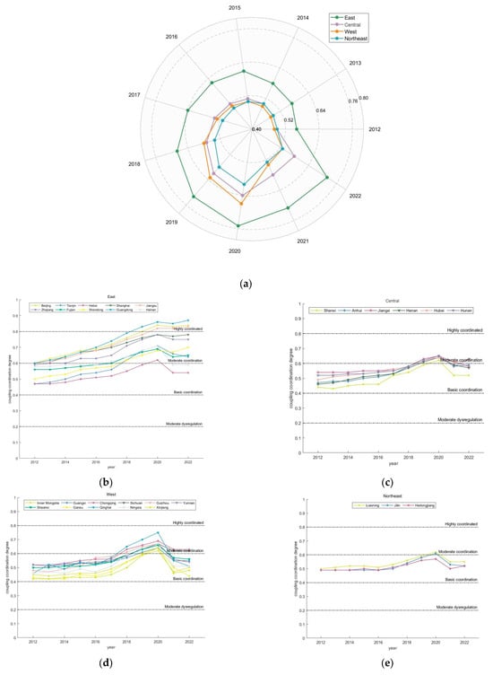 Results of changes in coupling and coordination degrees of the four regions. (a) Description of the overall perspective; (b) description of the eastern region; (c) description of the central region; (d) description of the western region; € description of the northeastern region.