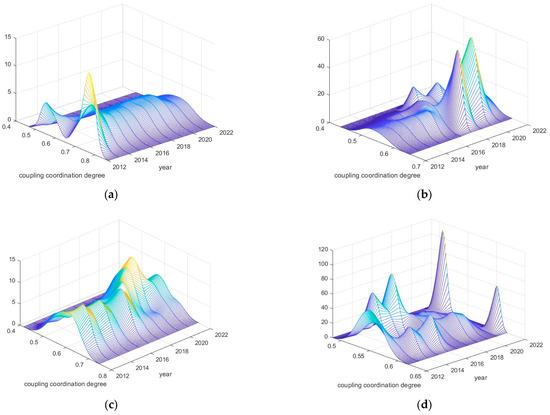 Estimation results of the kernel density of the coupling coordination degree of the four regions. (a) Description of the eastern region; (b) description of the central region; (c) description of the western region; (d) description of the northeastern region.