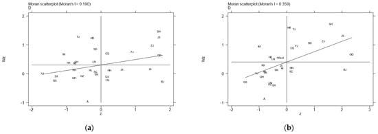 Moran’s I index results. (a) Description of the results for the year 2012; (b) description of the results for the year 2022.