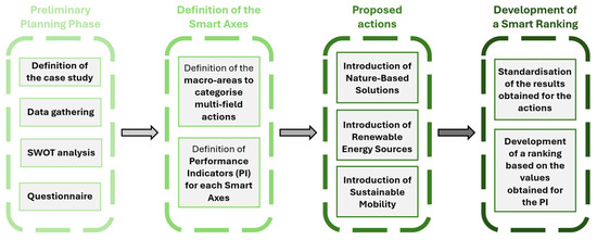 The initial stage of the process involves a preliminary planning phase, which includes defining the case study, starting with its morphological characteristics, followed by the collection of structural, climatic, and environmental data. The data are then used to create a model of the case study in all its dimensions, thereby providing a reference scenario against which the effectiveness of the proposed interventions can be assessed. A SWOT analysis was then conducted to gather additional information on the case study—precisely its challenges and strengths. Based on the insights obtained from this analysis, a questionnaire focusing on the key points of interest identified by the authors was developed and distributed virtually to the city’s residents. The results were then analysed and tabulated to provide a comprehensive view of the expressed issues and set out the guidelines for smart design.