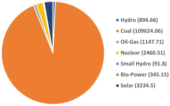 Regarding the energy mix, Uttar Pradesh, where Varanasi is situated, relies heavily on coal for electricity generation [47], with smaller contributions from solar, nuclear, oil, and gas sources. This energy context (Figure 2) emphasises the necessity to diversify energy sources and increase the integration of renewable energy to reduce environmental impact and enhance regional sustainability.