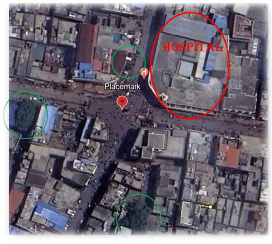 As highlighted in the case study, the Godowlia area in Varanasi suffers from significant issues, including traffic congestion, high levels of air pollution, and a lack of green spaces. As illustrated in Figure 6, the area is represented before implementing any interventions, with green circles highlighting the only trees in the area. To address these challenges, a series of NBS was proposed, involving planting trees and roof and façade greening for buildings near the Marwari Hospital. The ENVI-met software was utilised to simulate these proposals and analyse their effects on temperature and pollution levels.