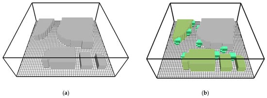 The simulation process was initiated with a baseline model of the area (Figure 7a), incorporating detailed data on building heights, asphalt roads, and meteorological conditions. The initial settings included hourly temperature and relative humidity values for a warm spring day retrieved from publicly available weather databases [52]. The chosen timeframe for the simulation was spring, a period of the year characterised by increased congestion attributable to more favourable weather conditions that encourage more significant movement and activity [53]. Additionally, this season represents when urban greenery is at its most vibrant, providing a realistic basis for evaluating the impacts of greening interventions. The parameters set to configure the module are shown in Table 5.