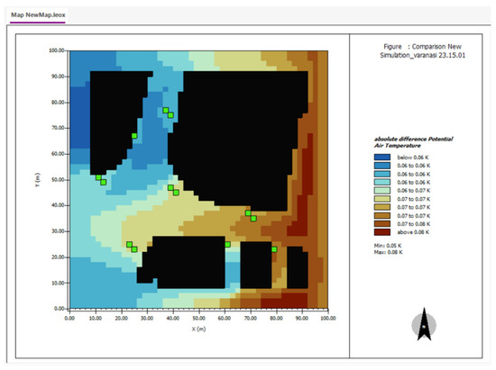 For the greening scenario, the layout was modified to include nine strategically placed trees and roof and façade greening for buildings surrounding the Marwari Hospital. The developed design is shown in Figure 7b. ENVI-met’s grid-based approach facilitated an accurate assessment of the available space, resulting in an estimated 800 m2 for roof greening. It was calculated that this area could accommodate approximately 1600 plants or saplings, which, based on the literature’s values, are expected to absorb 22 kg/year/tree [54] and 5 kg/year/plant of CO2 [55].