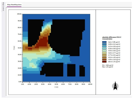 Furthermore, the capacity of ENVI-met to quantify PM2.5 concentration has been analysed and validated in the existing literature [51]. Despite certain limitations, such as the need for significant computational power, especially for large-scale urban areas or high-resolution models, and the simplification of certain environmental processes, ENVI-met is considered suitable for simulations due to its established ability to evaluate and optimise green spaces and quantify air quality parameters like PM2.5 concentrations. These strengths have been demonstrated in previous academic work, supporting its application in similar contexts. However, it is important to note that ENVI-met simulations may be subject to constraints such as protracted simulation times, even when utilising high-performance computing facilities. Additionally, while the model provides valuable insights into microclimate processes, it simplifies certain real-world physics—such as heat exchange—, which may not be as detailed as those produced by more complex Computational Fluid Dynamics (CFD) models. Moreover, modelling vegetation growth and evapotranspiration is somewhat simplified, which may not fully capture seasonal variations. Finally, using predefined weather conditions in the simulations limits the model’s adaptability to variable conditions.