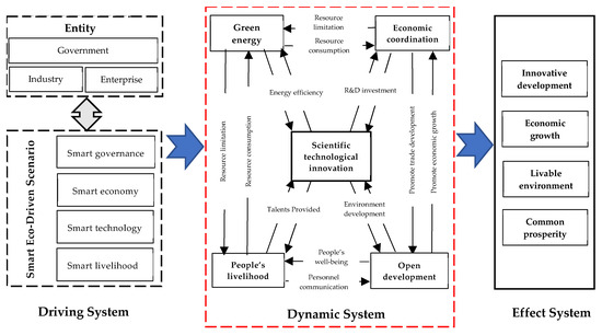 (2) Dynamic System. The dynamic system includes the economic system, energy system, population system, social system, environmental system, and technological system. Based on the existing research [48,49] and the development patterns of resource-based regions, this study constructs a dynamic system from five aspects: innovation, coordination, green development, openness, and sharing. This creates a scenario driven by smart eco-innovation. Among them, the innovation subsystem is the core. The five subsystems reflect technological innovation capacity, coordinated economic development, green energy status, open trends, and social welfare conditions, respectively.