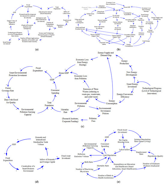 Causal loop diagrams of the five subsystems. (a) Scientific and technological innovation subsystem; (b) economic coordination subsystem; (c) green energy subsystem; (d) open development subsystem; (e) people’s livelihood subsystem. The blue arrow indicates the effect of A on B. “+” indicates a promoting effect, while “−” indicates an inhibitory effect.