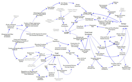 This paper integrates the interrelationships between key variables across subsystems. For example, it examines the relationship between smart energy investment in Figure 2c and new energy development in Figure 2b, the relationship between domestic and foreign capital inflows in Figure 2d and fixed asset investment, and the relationship between total population in Figure 2e and educational investment in Figure 2a. These relationships are used to describe causal feedback relationships in the system model, as shown in Figure 3.