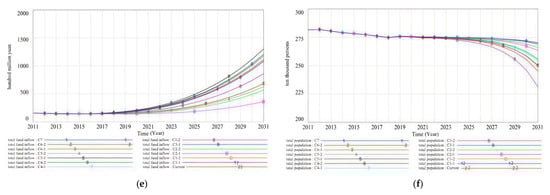 The simulation period was set from 2011 to 2030 with a step length of 1 year. The results for the six output variables under the 14 policy scenarios were obtained, as shown in Figure 5.