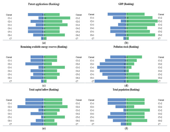 Ranking and statistical analysis of scenario simulation results. (a) Patent applications ranking; (b) GDP growth rate ranking; (c) remaining available energy reserves ranking; (d) pollution stock ranking; (e) total capital inflow ranking; (f) total population ranking. The lengths of the blue and green bars indicate the rank. In Figure 5, smaller numbers indicate higher-ranked lines, while larger numbers indicate lower-ranked lines. For example, number 1 represents the topmost line. Identical numbers for multiple policy scenarios indicate overlapping lines that cannot be distinguished in ranking. For instance, in the patent application ranking, five policy scenarios share the number 6, indicating their effects are indistinguishable at rank 6.