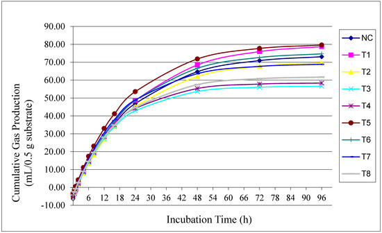 Gas production was assessed using the first set of bottles. Measurements were taken post-incubation at regular intervals: 0, 0.5, 1, 2, 4, 6, 8, 12, 16, 24, 48, 72, and 96 h. Gas production parameters were estimated using the model proposed by Ørskov and McDonald [37].