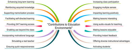 With the increasing demand for education, the integration of artificial intelligence (AI) and education has led to the emergence of a new research field, resulting in a growing body of literature on educational AI [44]. AI has been found to have a profound impact on various fields, including education. According to [7], AI in education is seen as a synthesis of three fundamental areas: knowledge, education, and computational science. Ref. [45] categorizes AI-powered educational tools into three main types: those aimed at students, teachers, and the educational system. In today’s society, children prefer learning resources to be at their fingertips and to learn at their own pace, making AI a promising tool to support students [46,47]. AI-driven applications such as personalized learning systems [48,49,50], chatbots [51], robots [52,53,54], online games [55], and simulations [7] are increasingly being utilized in education.
