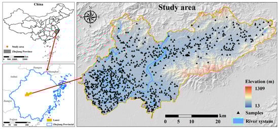 Lanxi City is situated in the central and western regions of Zhejiang Province, with coordinates ranging from 29°1′20″ to 29°27′30″ N and 119°13′30″ to 119°53′50″ E. Covering an area of 1313 square km (Figure 1), the city experiences a subtropical monsoon climate with significant annual rainfall. The terrain features a hilly basin at the heart of Zhejiang, bordered by mountains to the northeast, rolling low hills to the southwest, and a flat plain in the center. The main soil types in the research area, classified according to the World Reference Base for Soil Resources (WRB), include Acrisols (red soil), Alisols (yellow soil), Leptosols (lithological soil), Fluvisols (tidal soil), and Anthrosols (paddy soil), with agricultural land being the dominant land use. The main crops cultivated in the research area include maize, sweet potato, rice, rapeseed, and soybean. Additionally, a wide variety of fruits and vegetables are also extensively grown.