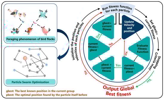 Particle Swarm Optimization (PSO) is a global optimization algorithm proposed by Kennedy and Eberhart and inspired by swarm intelligence and the foraging behavior of bird flocks []. In recent years, PSO has been widely used in variable combination optimization problems, especially in environmental variable selection tasks for high-dimensional complex data. PSO initializes the position and velocity of a particle swarm, evaluates the solution quality of each particle using a fitness function, and gradually approaches the optimal solution by updating the historical best position (pbest) of the particle itself and the global best position (gbest) of the population. In variable selection, the goal of PSO is usually to find the optimal feature subset by optimizing a specific objective function (such as minimizing prediction error or maximizing model interpretability), which can improve model performance and reduce redundant variables []. Compared with traditional optimization methods, PSO has the advantages of low computational complexity, easy implementation, and strong robustness; therefore, it is widely used in data analysis in fields such as agriculture, the ecological environment, and geographic information. Recent studies have shown that combining PSO with other technologies, such as machine learning algorithms or deep learning models, can further improve the efficiency and effectiveness of algorithms in variable selection []. The success of PSO lies in its excellent global search capability and strong adaptability, making it an important tool in the field of environmental variable screening and variable combination optimization. The operating principle is shown in Figure 2. In this study, PSO searches for the optimal combination of variables by simulating swarm intelligence, the particles adjust their positions in the search space to optimize the objective function, and, finally, the feature subset that can best predict the pH value is selected.