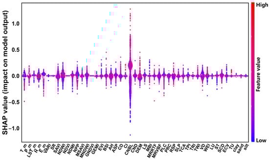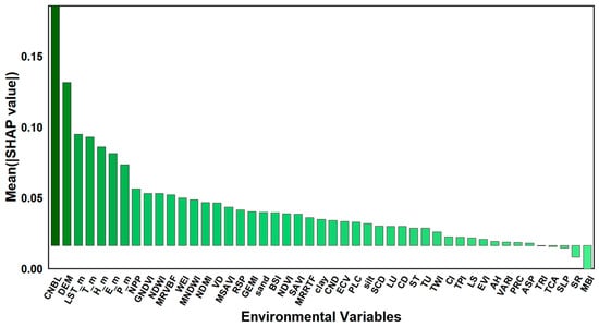 The SHAP model is used to measure the importance of environmental variables by calculating their marginal contributions to the soil pH prediction output. Compared with the RF importance assessment, this can better explain nonlinear and interactive effects. This study uses SHAP analysis to explain the important driving factors found with the RF model, and Figure 5 and Figure 6 show a visualization of 47 environmental variables that affect soil pH. Among them, CNBL shows the highest importance, followed by DEM, LST_m, T_m, H_m, E_m, P_m, NPP, GNDVI, NDWI, MRVBF, and WEI.
