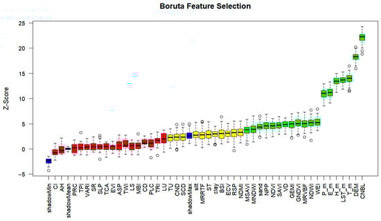 Unrelated or redundant variables in a dataset often reduce the performance of ML algorithms. As a data preprocessing strategy, variable selection has been proven to be an effective way to reduce the dimensionality of the feature space by identifying the subset that contributes the most to the target variable or output from the original variable set. Variable selection helps to construct predictive models without correlated variables, biases, and unwanted noise, significantly improving prediction accuracy and reducing overfitting and training time [,]. The Boruta algorithm is a variable selection method based on a Random Forest model that can effectively identify and remove noisy variables in input features through multiple repeated operations. Firstly, the Boruta algorithm adds additional randomness to the original variables by creating shadow variables, then trains a Random Forest classifier on an extended dataset, and evaluates the importance of each variable [,]. The Boruta algorithm is a fully correlated environmental variable screening method that attempts to find all variables related to the target variable, which is beneficial for better understanding the relationship between the predictor variable and the target variable, rather than constructing a black-box prediction model with good prediction accuracy []. Due to its foundation of multiple Random Forest operations and evaluation of input features through statistical testing, it is relatively conservative in feature deletion and less likely to lose important information.