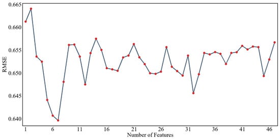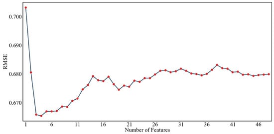 Figure 8 and Figure 9 show the results of screening environmental variables of soil pH based on the RFE algorithm and PSO algorithm, respectively, with the RMSE as the evaluation index. From the graph, it can be seen that as the number of feature variables increases or decreases, the RMSE shows significantly different trends, indicating that the number of environmental variables does not determine the performance of the model when constructing a prediction model. As shown in Figure 8, according to the feature selection results for soil pH in the study area based on the RFE algorithm, it can be seen that when the RMSE reaches the lowest value, the optimal number of predictive factors is 4. Therefore, this group is the selected optimal variable set. At this point, the selected set of environmental variables includes the following: one terrain factor (CNBL) and three climatic factors (P_m, LST_m, E_m). As shown in Figure 8, according to the feature screening results for soil pH in the study area based on the PSO algorithm, it can be seen that when the RMSE reaches the lowest value, the optimal number of predictive factors is 7. Therefore, this group is the selected optimal variable set. At this point, the selected set of environmental variables includes two terrain factors (CNBL, DEM) and five climatic factors (E_m, H_m, LST_m, T_m, P_m).