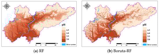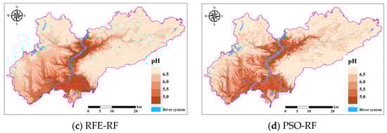 The spatial distribution of soil pH in the study area predicted with the Boruta-RF, RFE-RF, and PSO-RF models based on the full-variable RF model and feature screening is shown in Figure 10. Overall, the spatial distribution trend of soil pH predicted by the three models in the study area is basically consistent, with most soils being acidic, showing a spatial distribution pattern where soil pH values in the eastern and northern regions are higher than those in the central, western, and southern regions. This distribution pattern may be closely related to terrain undulations and hydrological conditions.