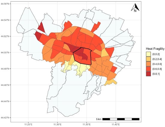 Visual representation of the social vulnerability to extreme heat indicator (normalized index) on the Bologna Municipality map. The historic city center is identified by the black line. Source: authors’ elaboration based on Maccabiani, E.; Usmani, M.; Nanni, R.; Napolitano, M. “Investigating Social Vulnerability to Extreme Heat: Heat Islands and Climate Shelters in Urban Contexts: The Case of Bologna”. ISPRS Int. J. Geo-Inf. 2025, 14, 17 [35].